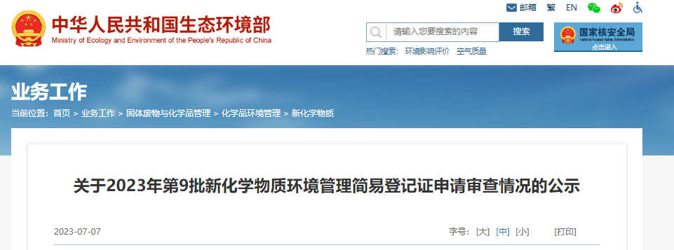 2023年7月7日,生态环境部发布了关于2023年第9批新化学物质环境管理简易登记证申请审查情况的公示,具体内容如下: