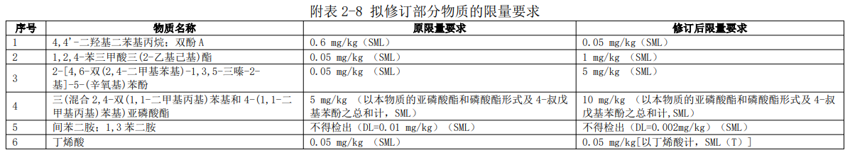 - 金属迁移限量调整: 修订附录C,将锌元素的特定迁移量调整为5mg/kg,并新增铝元素的特定迁移量为1mg/kg。