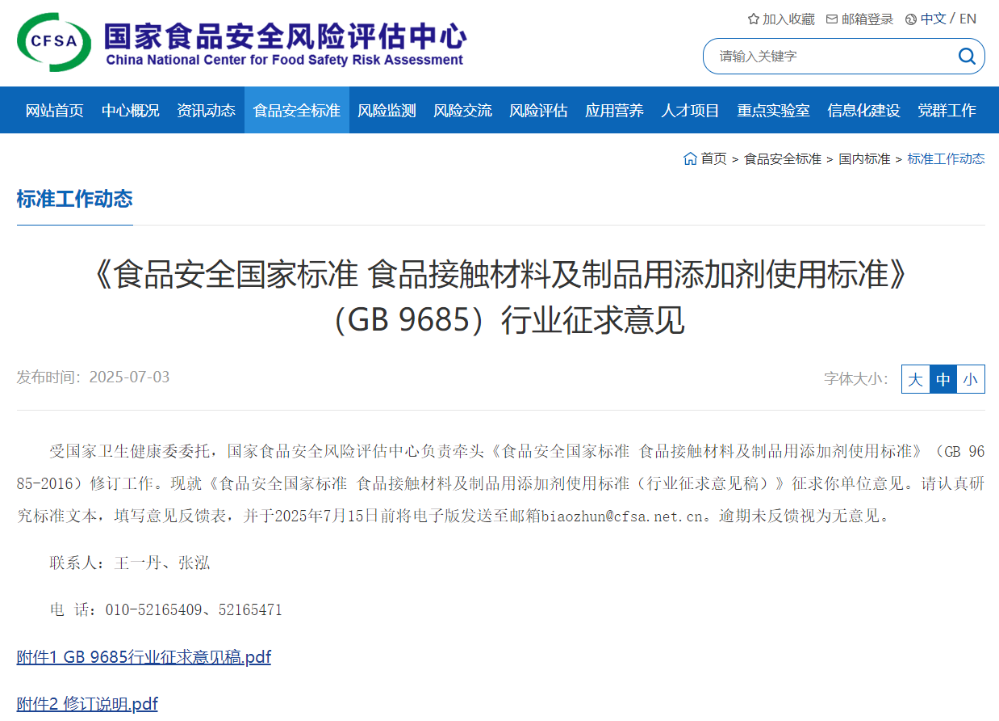 2025年7月3日,国家食品安全风险评估中心发布重要公告,正式就《食品安全国家标准 食品接触材料及制品用添加剂使用标准》(行业征求意见稿)公开征求意见。此次修订工作受国家卫生健康委员会委托,旨在进一步保障食品接触材料的安全。