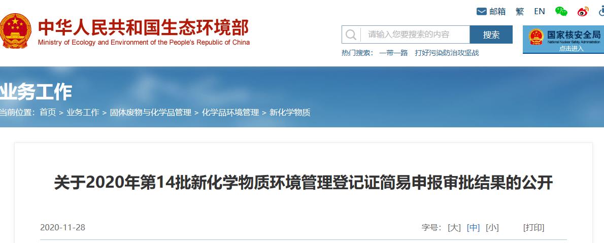 生态环保部按照《中华人民共和国政府信息公开条例》(国务院令第711号)的要求,现将2020年第14批新化学物质环境管理登记证简易申报审批结果予以公开。