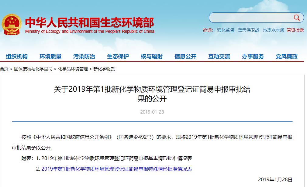 生态环境部发布关于2019年第1批新化学物质环境管理登记证简易申报审批结果