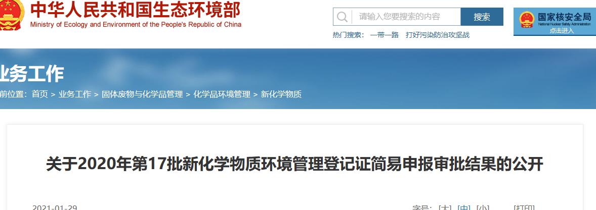 生态环保部按照《中华人民共和国政府信息公开条例》(国务院令第711号)的要求,现将2020年第17批新化学物质环境管理登记证简易申报审批结果予以公开。