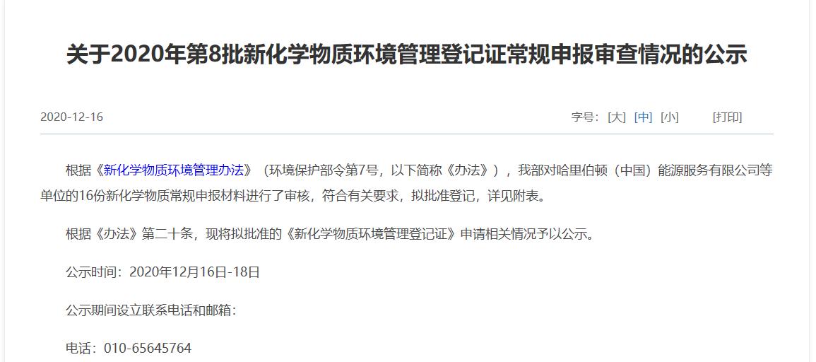 根据《新化学物质环境管理办法》(环境保护部令第7号,以下简称《办法》),生态环境部对哈里伯顿(中国)能源服务有限公司等单位的16份新化学物质常规申报材料进行了审核,符合有关要求,拟批准登记,详见附表。