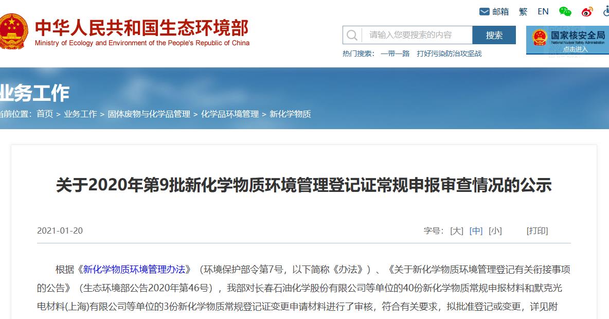 - 生态环保部发布关于2020年第1批新化学物质环境管理登记证常规申报审查情况