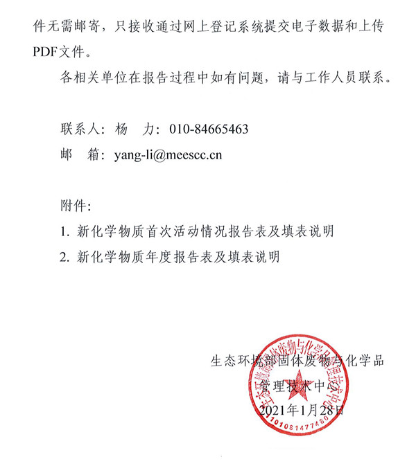 2021年1月29日,生态环境部发布关于提交新化学物质首次活动报告和2020年度活动报告的通知。原文如下: