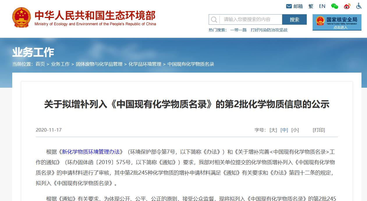 2020年12月21日,生态环境部官方网站发布《关于增补<中国现有化学物质名录>的公告》(2020年第67号)(以下称《公告》),把符合《关于增补完善〈中国现有化学物质名录〉工作的通知》(环办固体函〔2019〕575号,以下称《通知》)的相关规定和要求,第2批共238种化学物质增补列入《中国现有化学物质名录》(以下称《名录》),并按现有化学物质管理。