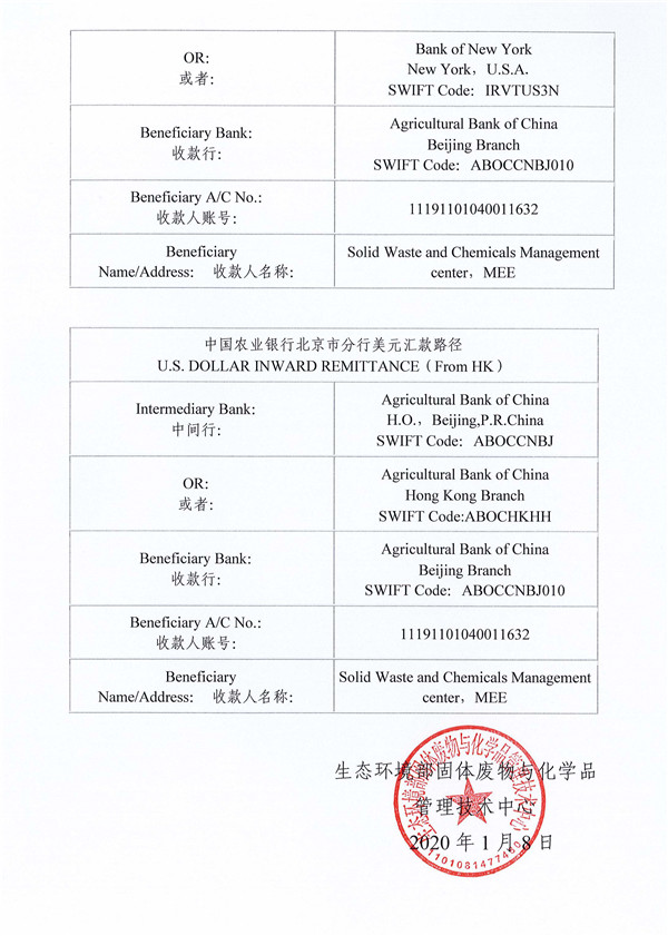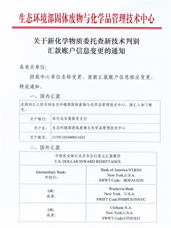2020年1月14日,生态环境部固体废物与化学品管理技术中心发布关于新化学物质委托查新技术判别汇款账户信息变更的通知。原文如下:
