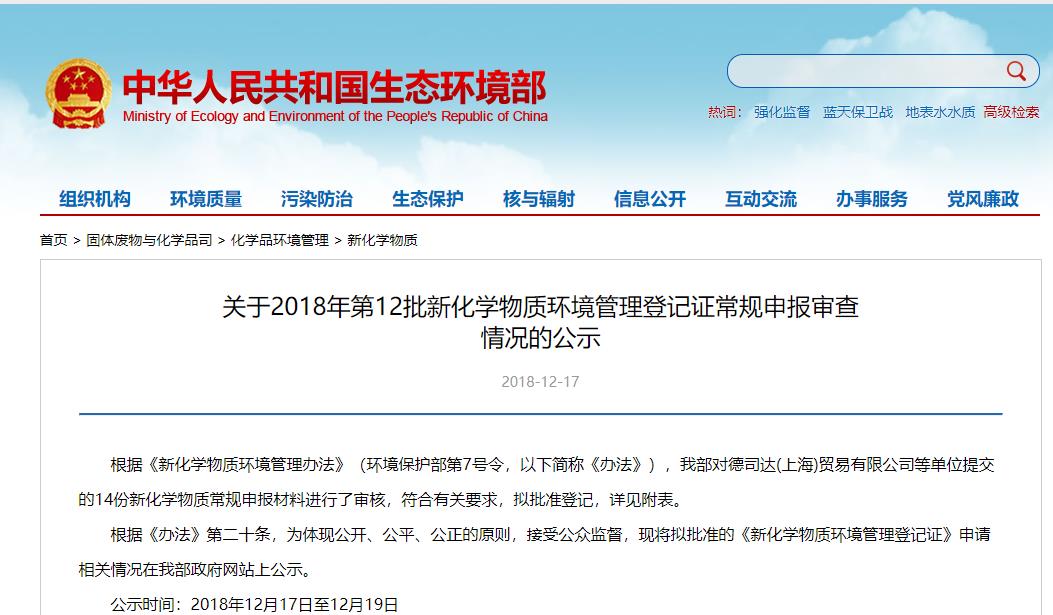 生态环境部关于2018年第12批新化学物质常规申报环境管理登记证申请审查情况的公示