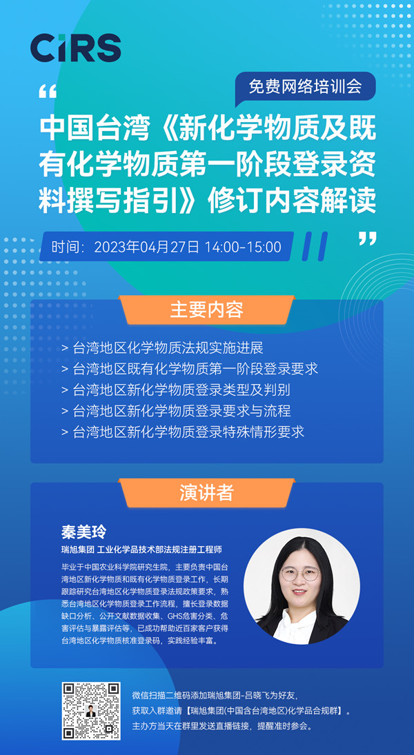 为了能够更好的帮助企业理解中国台湾地区本次修订的《新化学物质及既有化学物质第一阶段登录资料撰写指引》的内容变化,掌握台湾地区新化学物质与既有化学物质第一阶段登录的相关要求,瑞旭集团工业化学品技术部台湾化学品注册团队计划于4月27日举办网络培训会“中国台湾地区《新化学物质及既有化学物质第一阶段登录资料撰写指引》修订内容解读”,向广大关注台湾地区化学物质管理政策的企业提供专业的法规解读和合规建议,敬请您的关注。