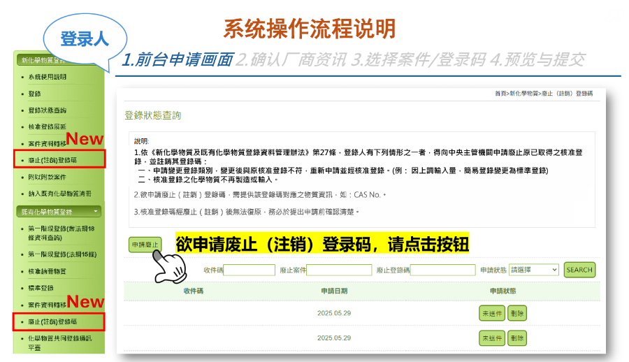 届时登录人/代理人可登录平台(https://tcscachemreg.moenv.gov.tw),进入“废止(注销)登录码”模块在线提交申请。对于登录人自行完成登录和/或由代理人协助完成登录的登录码,有不同的操作要求,详见图1-8。