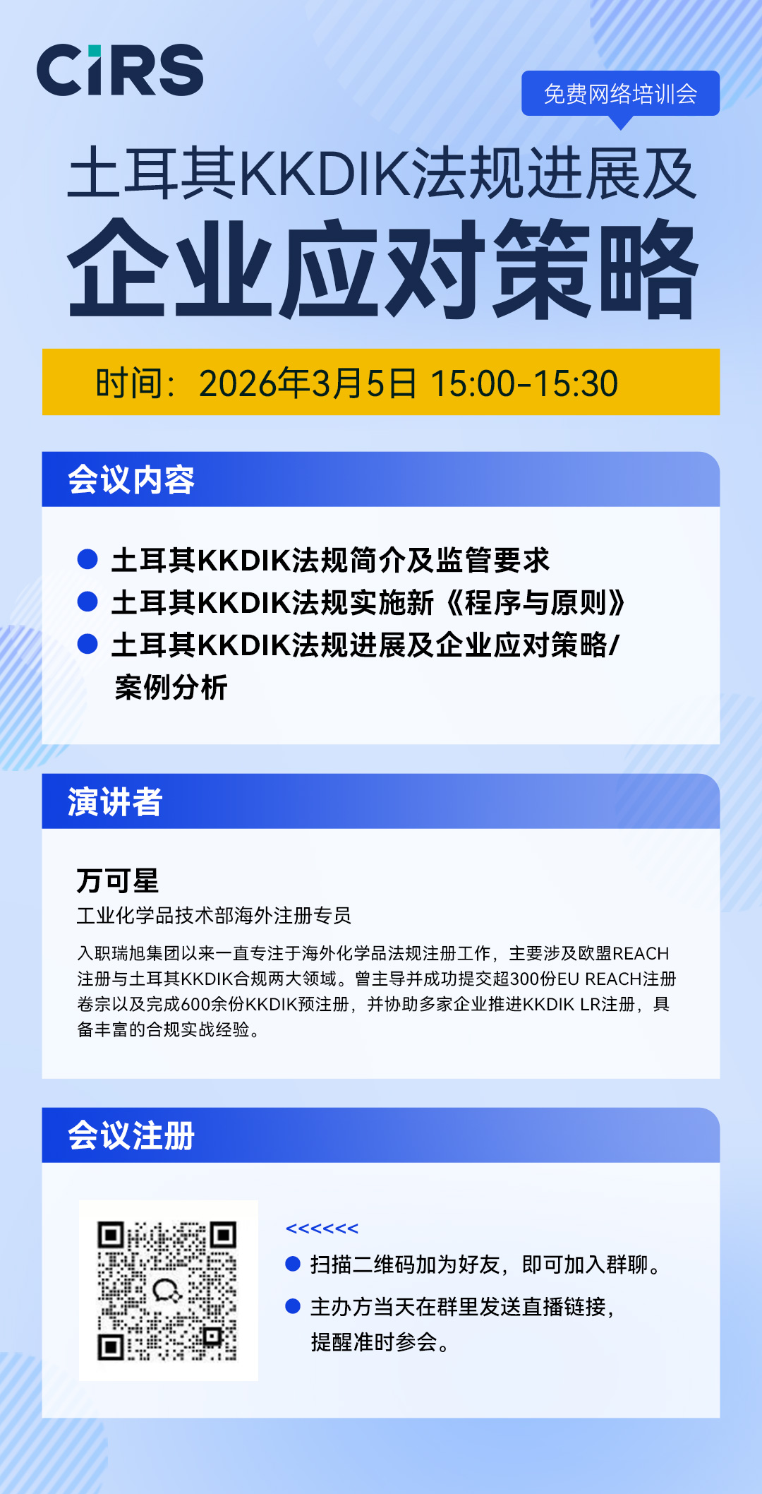 扫描下方二维码加为好友,即可加入群聊。主办方当天在群里发送直播链接,提醒准时参会。