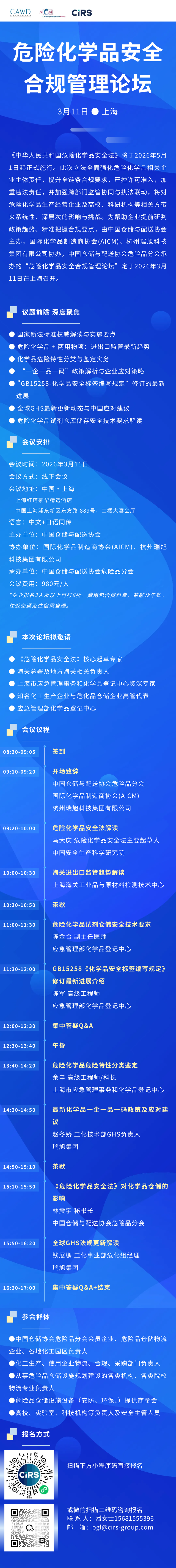 《中华人民共和国危险化学品安全法》将于2026年5月1日起正式施行。此次立法全面强化危险化学品相关企业主体责任,提升全链条合规要求,严控许可准入,加重违法责任,并加强跨部门监管协同与执法联动,将对危险化学品生产经营企业及高校、科研机构等相关方带来系统性、深层次的影响与挑战。为帮助企业提前研判政策趋势、精准把握合规要点,由中国仓储与配送协会主办,国际化学品制造商协会(AICM)、杭州瑞旭科技集团有限公司协办,中国仓储与配送协会危险品分会承办的“危险化学品安全合规管理论坛”定于2026年3月11日在上海召开。