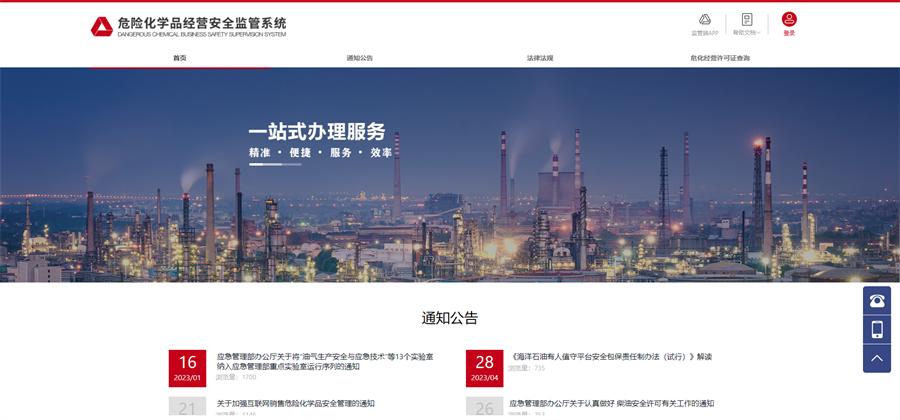 危险化学品经营安全管理系统是国家应急管理部推出的服务平台。该平台用于录入具有危险化学品经营许可证的企业的信息,并拥有企业许可经营范围的查询功能。同时,网站拥有专栏,用于发布相关重要法律法规,为企业提供法规指导。此外,平台还为企业提供了填报相关的文档与视频指导手册。如果在填报中发现问题,也可以通过手册查阅得到解答。