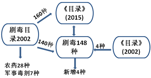 定义和判定界限的变化带来了剧毒化学品数目的巨大变化,如下图所示,新《目录》保留《剧毒化学品目录》(2002版)中的140种化学品为剧毒化学品管理,新增4中剧毒化学品(一氟乙酸对溴苯胺、2,3,4,7,8-五氯二苯并呋喃、2-硝基-4-甲氧基苯胺、氟乙酸甲酯),另有《目录》(2002版)中的4种纳入剧毒化学品(氯化氰、三正丁胺、亚砷酸钙、1-(对氯苯基)-2,8,9-三氧-5-氮-1-硅双环(3,3,3)十二烷(毒鼠硅))管理,共计条目148种,与《剧毒化学品目录》(2002版)含有335种相比,减少了187种。《剧毒化学品目录》(2002版)中的160种化学品列入新《目录》,删除了其中的农药28种及军事毒剂7种。