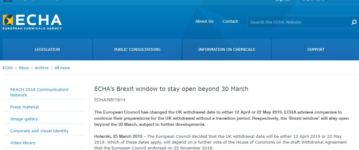 3月12日起ECHA开放了“脱欧窗口(Brexit window)”,英国的注册者可以选择将注册转移到欧盟(EU-27)的生产商,进口商或者唯一代表(OR)实体,以保持注册号的有效性。面对目前扑朔迷离的脱欧大战,为了避免注册号失效,英国的很多企业已经行动起来,年初到现在,英国已经有近3000多个注册转移至欧盟27国家。“脱欧窗口”在3月30日之后将继续开放,英国的注册者可以在实际脱欧日之前启动注册号的转移,而欧盟的注册接收者应当在实际脱欧日之后再接收该转移。