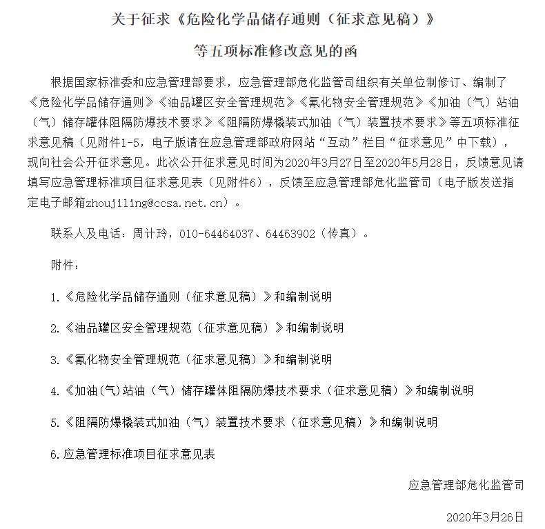 2020年3月26日,根据国家标准委和应急管理部要求,应急管理部危化监管司组织有关单位制修订、编制了《危险化学品储存通则》《油品罐区安全管理规范》《氰化物安全管理规范》《加油(气)站油(气)储存罐体阻隔防爆技术要求》《阻隔防爆橇装式加油(气)装置技术要求》等五项标准征求意见稿(见附件1-5,电子版请在应急管理部政府网站“互动”栏目“征求意见”中下载),现向社会公开征求意见。此次公开征求意见时间为2020年3月27日至2020年5月28日,反馈意见请填写应急管理标准项目征求意见表(见附件6),反馈至应急管理部危化监管司(电子版发送指定电子邮箱zhoujiling@ccsa.net.cn)。