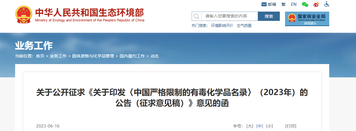 2023年6月16日,生态部发布了关于公开征求《关于印发〈中国严格限制的有毒化学品名录〉(2023年)的公告(征求意见稿)》意见的函。