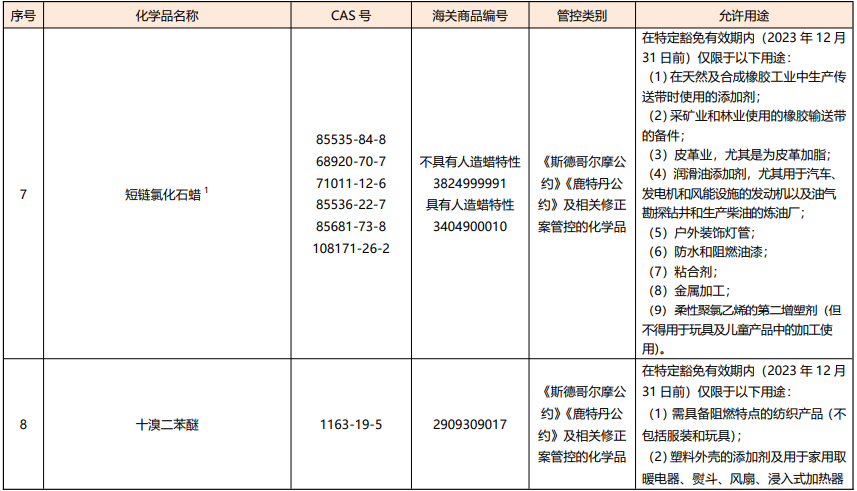 三是 更新短链氯化石蜡的物质信息和管控要求。依据《修正案》《清单》有关规定,更新了短链氯化石蜡的化学文摘社登记号(CAS 号)及其允许用途。
