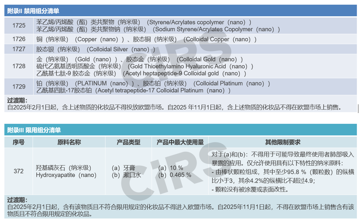 修订内容:禁用5项纳米级原料,并将羟基磷灰石(纳米级)纳入限用物质清单。