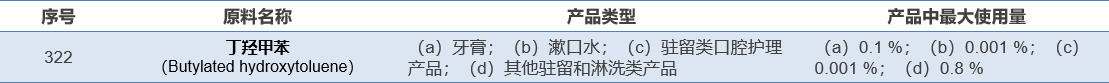 《2024年化妆品(化学物质限制)条例》(The Cosmetic Products (Restriction of Chemical Substances) Regulations 2024, 2024 No. 455) 对丁羟甲苯(Butylated hydroxytoluene, BHT) 的使用进行了限制。自制定之日起21天后生效,但对于在2025年2月24日之前已投放市场的产品,可继续销售至2025年6月24日。