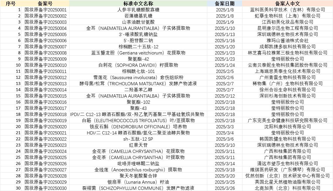 通过查询国家药品监督管理局,截至2025年3月31日,1月-3月共有30款化妆品新原料完成备案,目前相关技术要求均尚未披露,且尚未进入监测期。具体信息详见下表1。