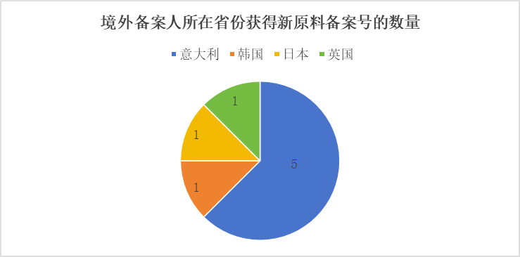 如下图3所示,4家境外备案人企业分别来自意大利、韩国、日本和英国四个国家/地区。其中,意大利企业获得的新原料备案号数量最多,共计5个,占2025年1-3月境外备案人企业新原料备案总数的62.5%;其余三个国家/地区的企业备案号数量均为1个。