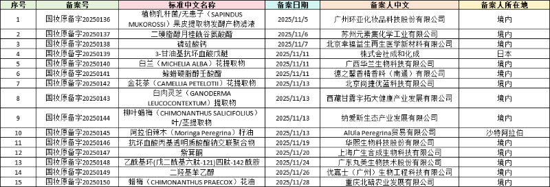 通过查询国家药品监督管理局,2025年11月共有 15款化妆品新原料完成备案,目前相关技术要求均尚未披露,且尚未进入监测期,具体信息详见下表1。截至2025年11月30日,2025年共有149款新原料通过备案。