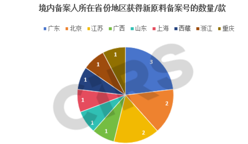 根据对新原料备案数据的分析,13款新原料由中国境内企业完成备案,涉及的13家企业分布于9个省份地区,包括广东、北京、江苏、广西、山东、上海、西藏、浙江和重庆。如图2所示,在所有境内备案企业所属省份及地区中,广东获得的新原料备案数量最多,为3个,共占2025年11月新原料备案企业总备案量的20%。