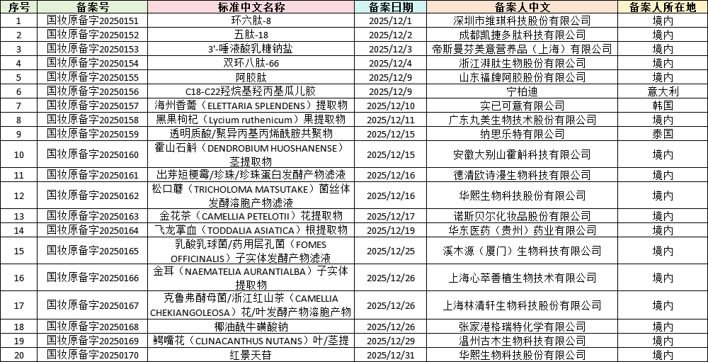 一、2025年12月中国化妆品新原料备案及注册数