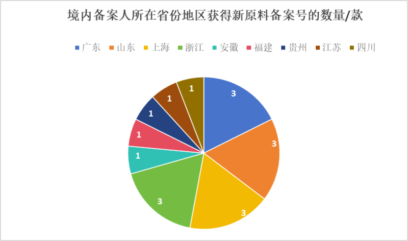 根据对新原料备案数据的分析,17款新原料由中国境内企业完成备案,涉及的16家企业分布于9个省份地区,包括广东、山东、上海、浙江、安徽、福建、贵州、江苏和四川。如图2所示,在所有境内备案企业所属省份及地区中,广东、山东、上海、浙江获得的新原料备案数量最多,均为3个,共占2025年12月新原料备案企业总备案量的60%。