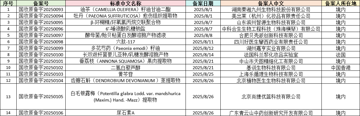 通过查询国家药品监督管理局,2025年8月共有14款化妆品新原料完成备案,目前相关技术要求均尚未披露,且尚未进入监测期,具体信息详见下表1。截至2025年8月31日,2025年共有105款新原料通过备案。