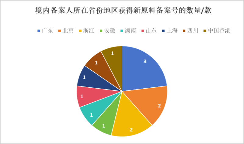根据对新原料备案数据的分析,13款新原料由中国境内企业完成备案,涉及的13家企业分布于9个省份地区(特别行政区),包括广东、北京、浙江、安徽、湖南、山东、上海、四川和中国香港。如图2所示,在所有境内备案企业所属省份及地区中,广东省获得的新原料备案数量最多,为3个,占2025年8月新原料备案企业总备案量的约23%。