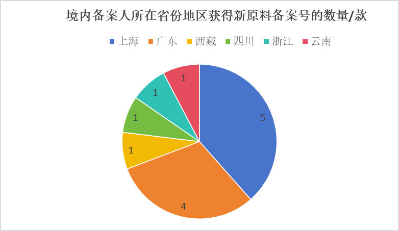 根据对新原料备案数据的分析,13款新原料由中国境内企业完成备案,涉及的11家企业分布于6个省份地区,包括上海、广东、西藏、四川、浙江和云南。如图2所示,在所有境内备案企业所属省份及地区中,位于上海的备案企业获得的新原料备案数量最多,为5个,约占2026年3月新原料备案企业总备案量的33.3%。