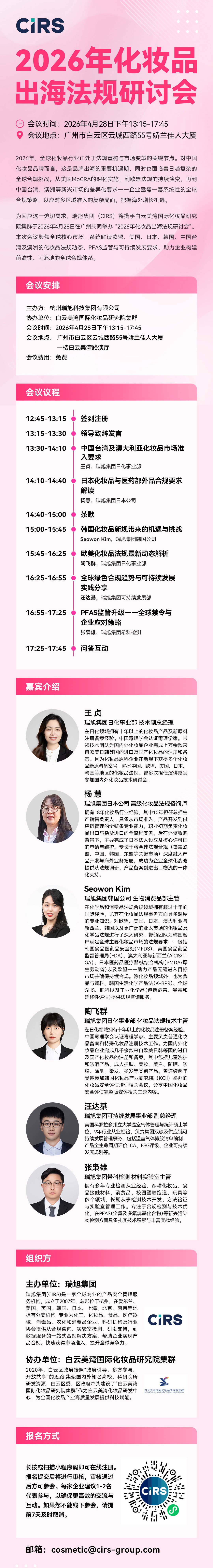 为回应这一迫切需求,瑞旭集团(CIRS)将携手白云美湾国际化妆品研究院集群于2026年4月28日在广州共同举办 “2026年化妆品出海法规研讨会”。本次会议聚焦全球核心市场,系统解读欧盟、美国、日本、韩国、中国台湾及澳洲的化妆品法规动态、PFAS监管与可持续发展要求,助力企业构建前瞻性、可落地的全球合规体系。