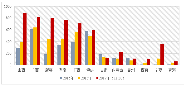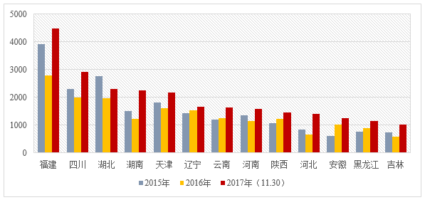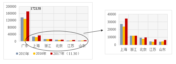 11月30日,广东省的国产非特殊用途化妆品备案编号已为“粤G妆网备字2017172138”,而2015年和2016年的国非备案编号截止为“粤G妆网备字2015136731”和“粤G妆网备字2016128659”。上海市国非特年备案量均超过2万件,2017年11月底已超3万件;浙江省的国非特年备案量基本保持在12000件左右。从图1统计中,我们不难发现内蒙古、贵州、西藏、青海等地区年备案量低于200件, 但也处于增长趋势。