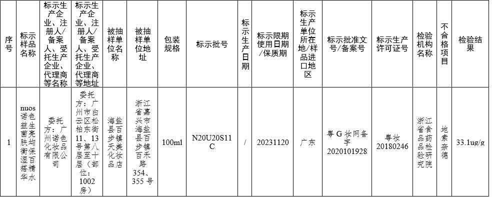 在2021年国家化妆品监督抽检工作中,经浙江省食品药品检验研究院检验,标示为委托方广州诺色化妆品有限公司生产的nuos诺色益生菌亮肤均衡保湿百搭精华水检出《化妆品安全技术规范(2015年版)》中规定的禁用原料(见附件)。