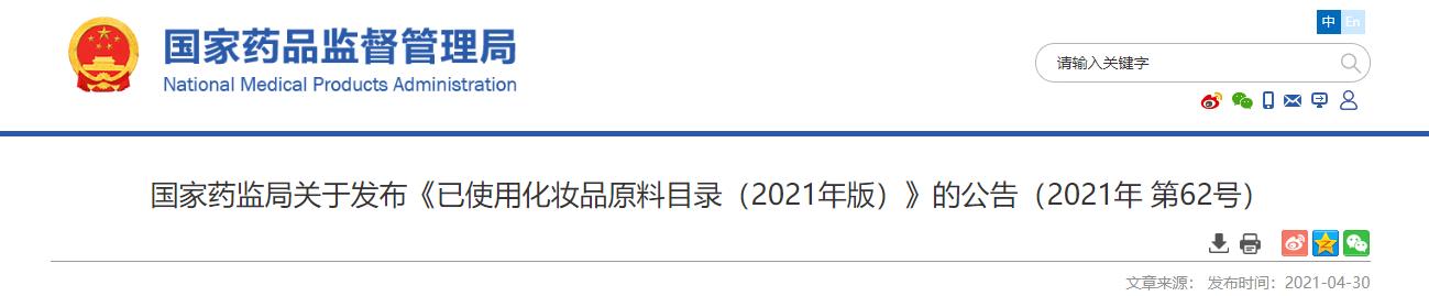 国家药监局关于发布《已使用化妆品原料目录(2021年版)》的公告(2021年 第62号)