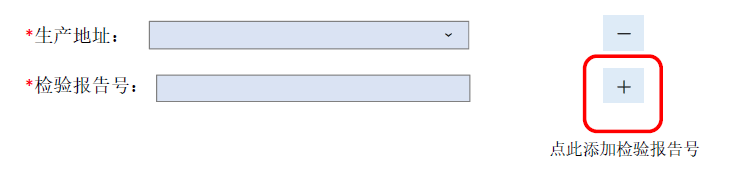 应在“备案申请表”中点击“+”增加“检验报告号”,再逐一进行填报。