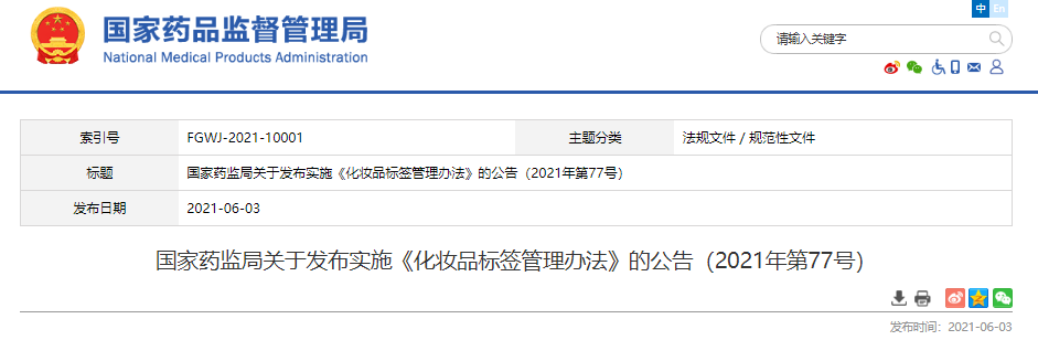 2021年5月31日,国家药监局关于发布实施《化妆品标签管理办法》的公告(2021年第77号),具体内容如下: