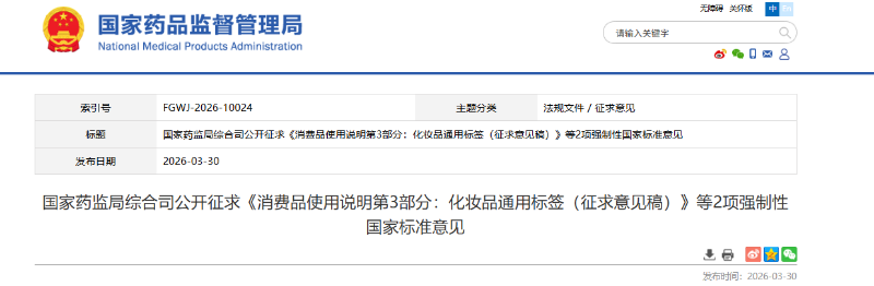 2026年3月30日,国家药监局综合司公开征求《消费品使用说明第3部分:化妆品通用标签(征求意见稿)》等2项强制性国家标准意见。