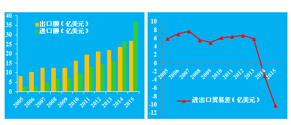 图1 2005-2015年化妆品进口额及出口额 图2 2005-2015年化妆品进出口贸易差