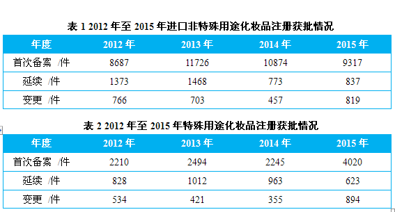 通过对2012年至2015年化妆品注册情况分析(表1 和表2)可得,2015年首次备案产品总量与2014年基本持平。由于美白产品被纳入祛斑管理,2015年进口非特殊用途化妆品变更量、特殊用途化妆品首次申报量及特殊用途化妆品变更量相较前三年呈大幅增长,而进口非特殊用途化妆品备案量有所下降。