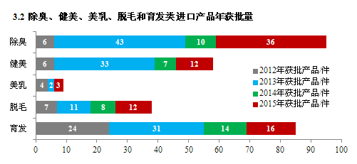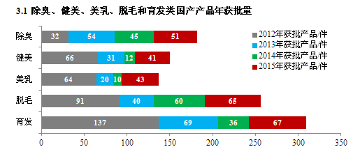 图3 除臭、健美、美乳、脱毛及育发类产品年获批数量对比图