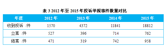 这5类产品的年获批量主要取决于个别生产企业新产品的定位。若企业在一定时间内主要推广某类特定化妆品,那么这类化妆品的年获批量会受到很大的影响。例如除臭类产品2013年和2015年获批量分别为43款和36款,远高于2012年和2014年获批量。这主要是联合利华在2013年和2015年均有近20款除臭产品(舒耐、多芬)进行注册。(3)投诉举报情况