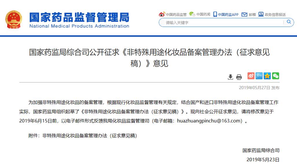 2019年05月27日,国家药监局综合司公开征求《非特殊用途化妆品备案管理办法(征求意见稿)》意见。请将修改意见于2019年6月15日前,以电子邮件形式反馈我局化妆品监督管理司(电子邮箱:huazhuangpinchu@163.com)。