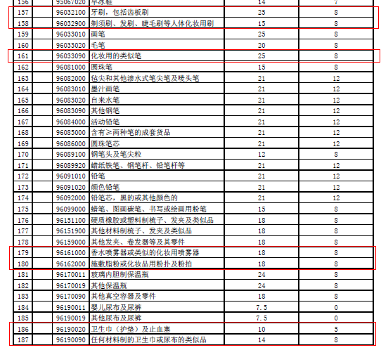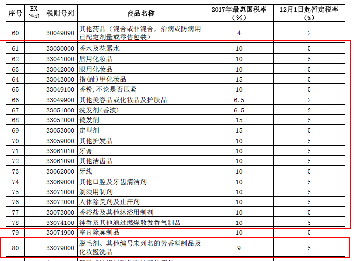 自2015年以来,国务院已经陆续降低部分服装、箱包、鞋靴、特色食品和药品等消费品的进口关税。在此前降税的基础上,本次进一步降低消费品进口关税,范围涵盖食品、保健品、药品、日化用品、衣着鞋帽、家用设备、文化娱乐、日杂百货等各类消费品,共涉及187个8位税号,平均税率由17.3%降至7.7%。以下是关于进口化妆品及相关个人护理用品的税率调整明细。