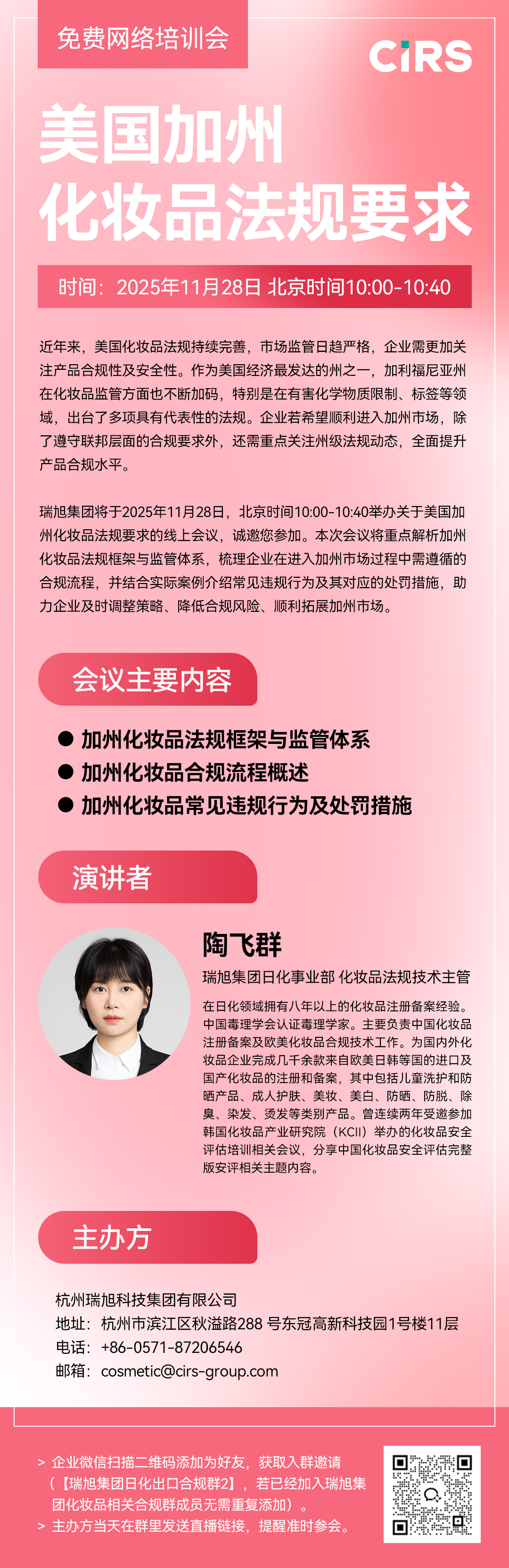 瑞旭集团将于2025年11月28日,北京时间10:00-10:40举办关于美国加州化妆品法规要求的线上会议,诚邀您参加。本次会议将重点解析加州化妆品法规框架与监管体系,梳理企业在进入加州市场过程中需遵循的合规流程,并结合实际案例介绍常见违规行为及其对应的处罚措施,助力企业及时调整策略、降低合规风险、顺利拓展加州市场。