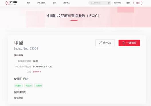 l 由瑞旭集团自主研发的中国化妆品原料法规数据库(妆合规)查询信息显示:甲醛(CAS No.50-00-0)在化妆品中用作抗菌剂、变性剂、防腐剂,目前已被列入中国已使用化妆品原料目录(2021年版)、中国化妆品原料禁用清单中的中国化妆品禁用组分名录。