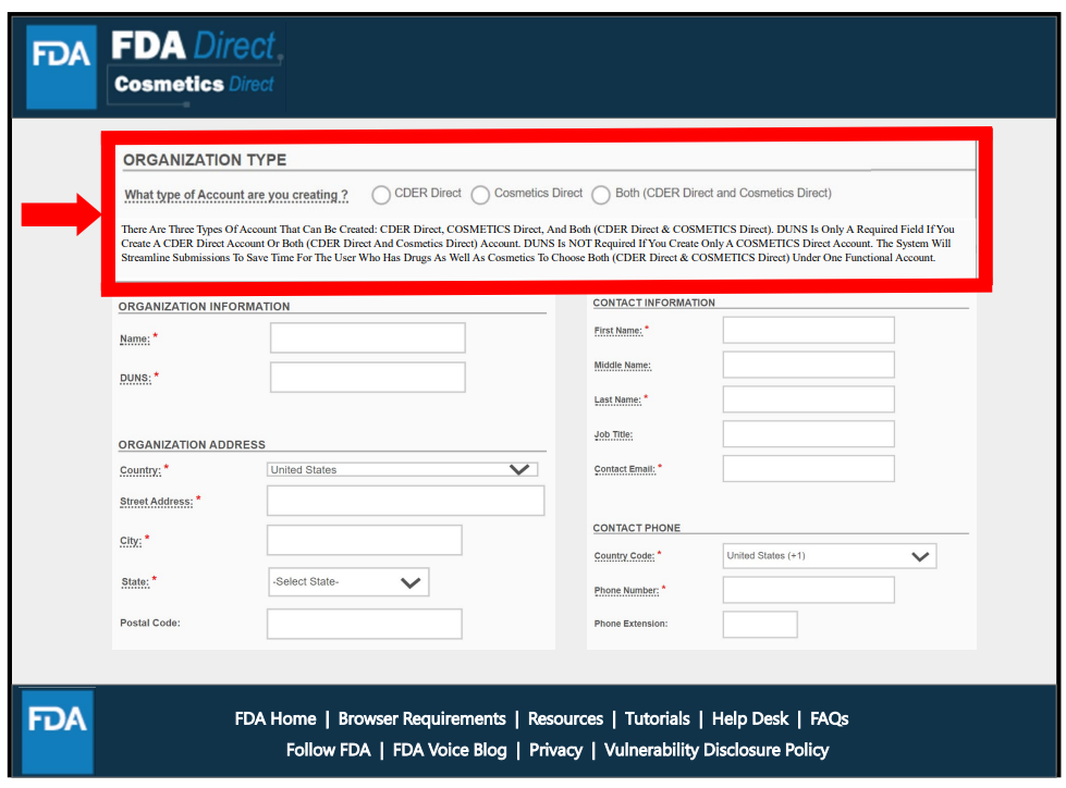 3种形式,可以创建独立的CDER Direct或COSMETICS Direct账号,也可同时开通两者。但仅创建Cosmetics Direct账户的无需提供邓白氏码(DUNS Number)。该过程需提交机构名称、地址、联系信息等。图中标星号为必填项。