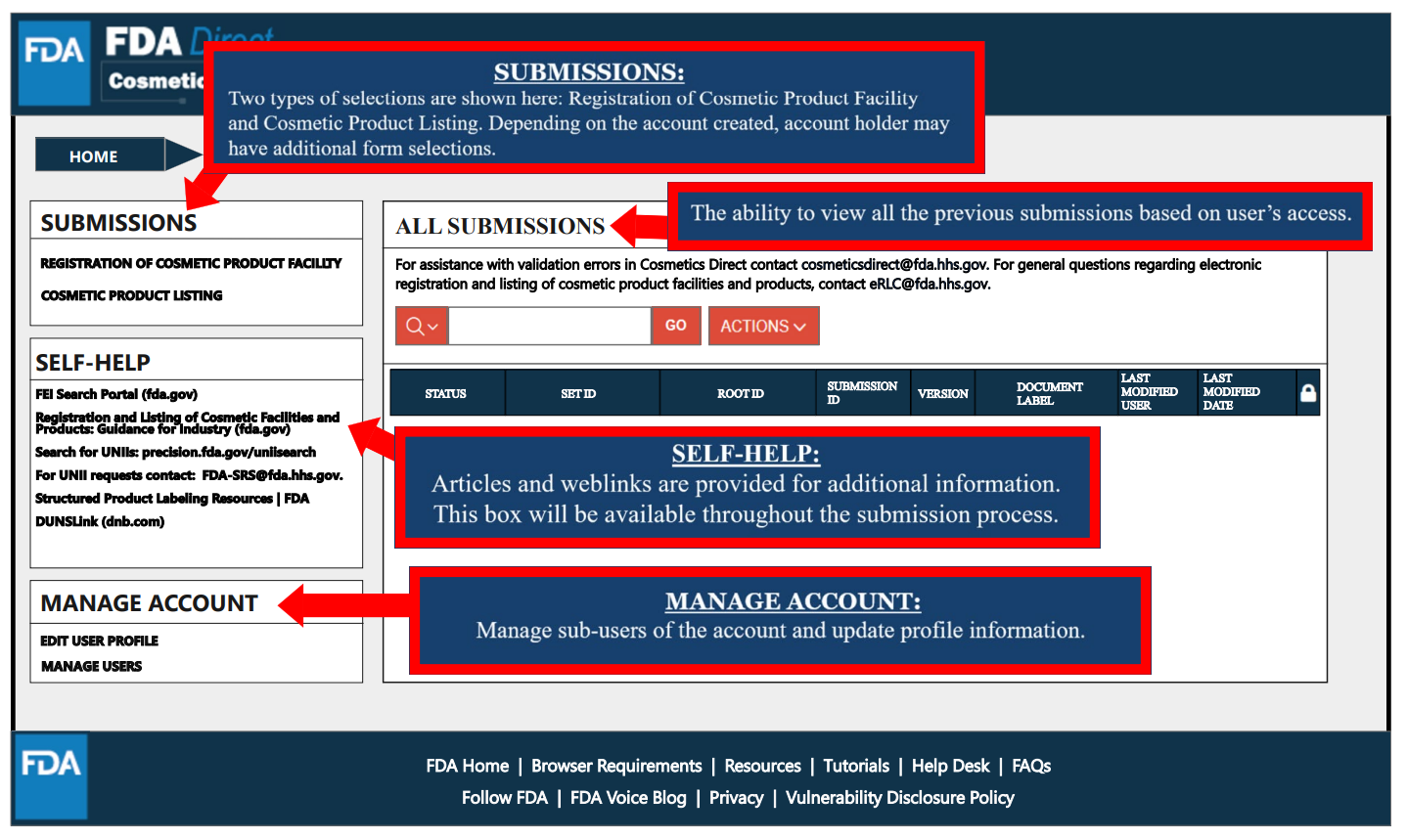 Cosmetics Direct主页面包括注册登记入口(可进行设施注册以及产品清单登记)、注册登记记录以及相关的FDA链接。